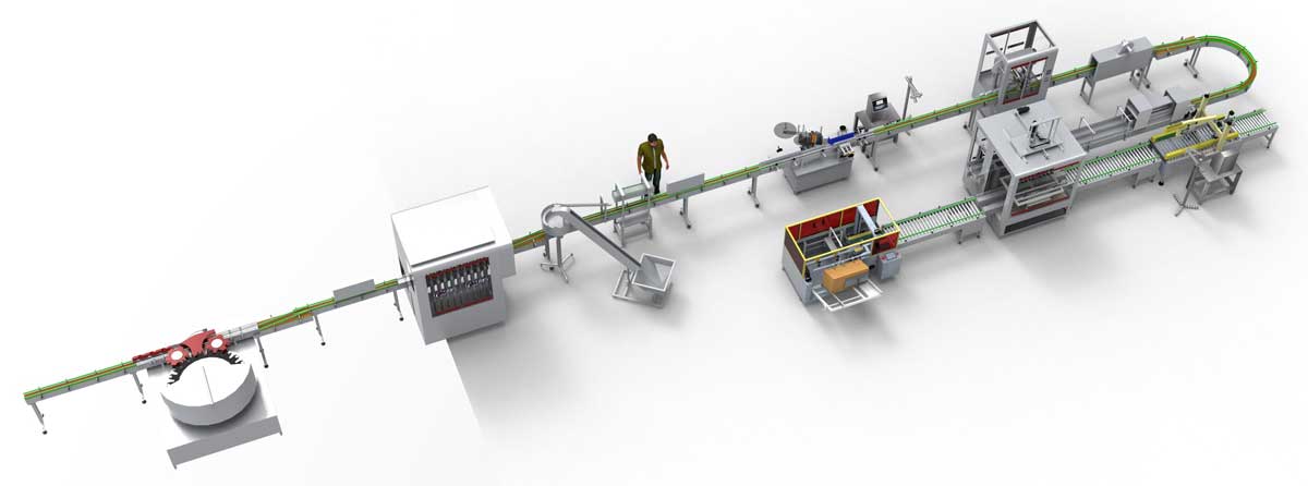 本線是一條常規(guī)的芝麻油香油灌裝線,空瓶為免洗瓶整跺進(jìn)入生產(chǎn)線,